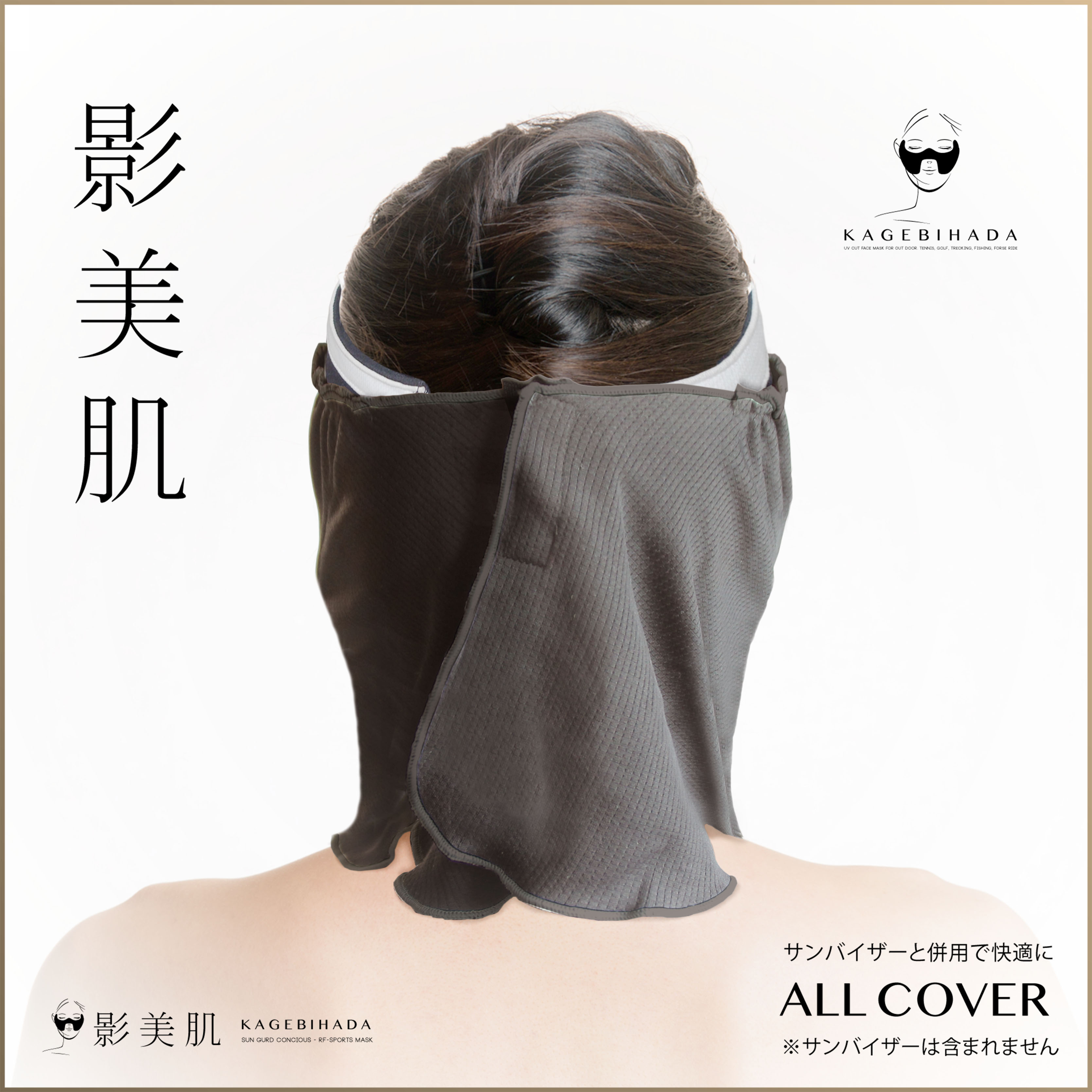 オールカバープレーンには影美肌のイニシャルKがワンポイントで入りました。オールカバータイプは 耳、デコルテ、首から首の後までと、シリーズの中で最も広範囲をカバーできるモデルです。耳ゴムに付け加えて、頭の後ろのボタンで固定します。また、後ろの部分はサンバイザーに引っ掛けれるようになっており、ずれ落ちるのを防止します。これだけガードしても、呼吸のしやすさはまったく変わりません。水分補給も、スカーフとマスクの間から簡単に行うことが出来ます。サンバイザーや日焼け止めなどと併用すると更に高い日焼け防止効果を得ることが出来ます。(耳ゴムの長さ調節機能付き)