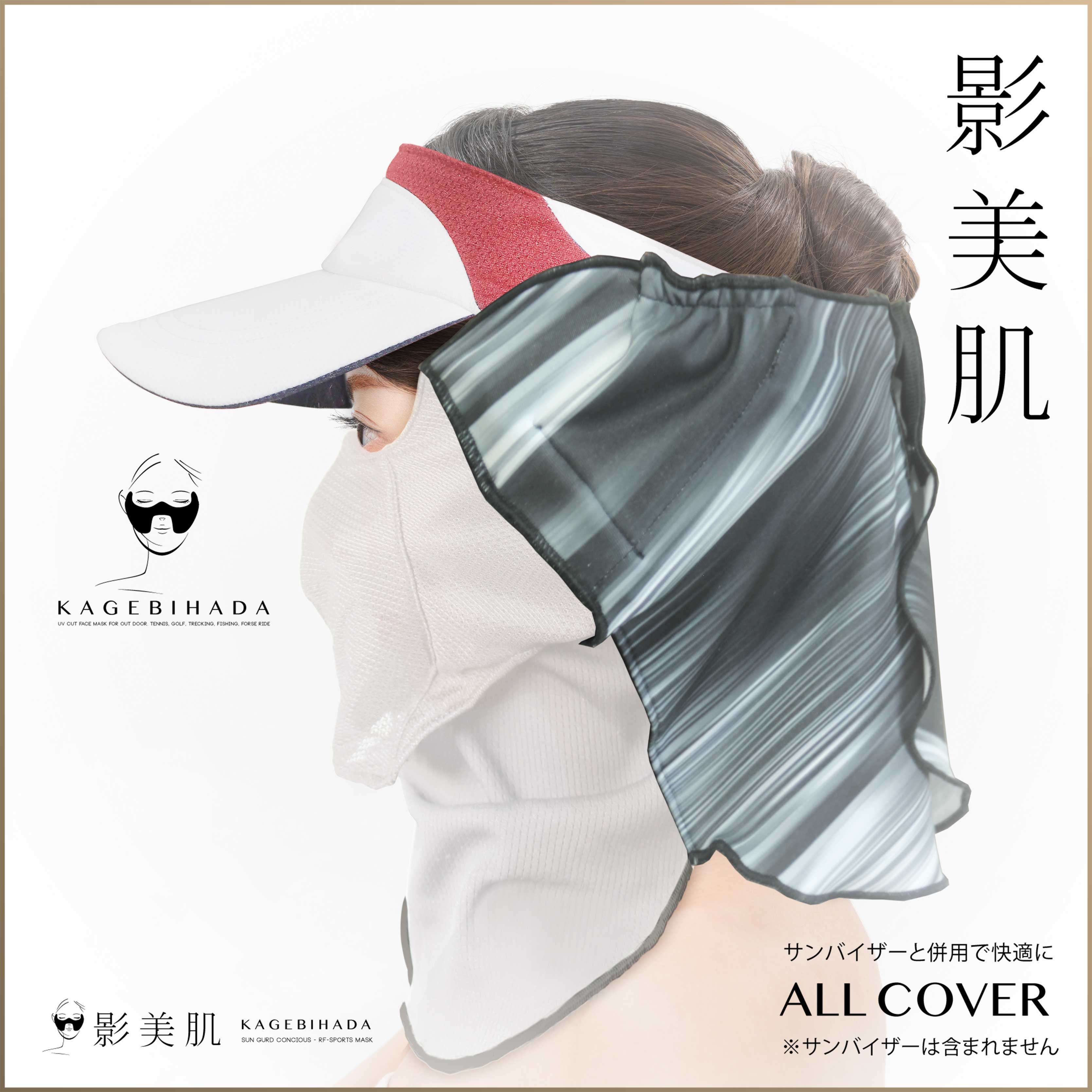 オールカバータイプは、耳、デコルテ、首から首の後までと、シリーズの中で最も広範囲をカバーできるモデルです。耳ゴムに付け加えて、頭の後ろのボタンで固定します。また、後ろの部分はサンバイザーに引っ掛けれるようになっており、ずれ落ちるのを防止します。これだけガードしても、呼吸のしやすさはまったく変わりません。水分補給も、スカーフとマスクの間から簡単に行うことが出来ます。サンバイザーや日焼け止めなどと併用すると更に高い日焼け防止効果を得ることが出来ます。(耳ゴムの長さ調節機能付き)