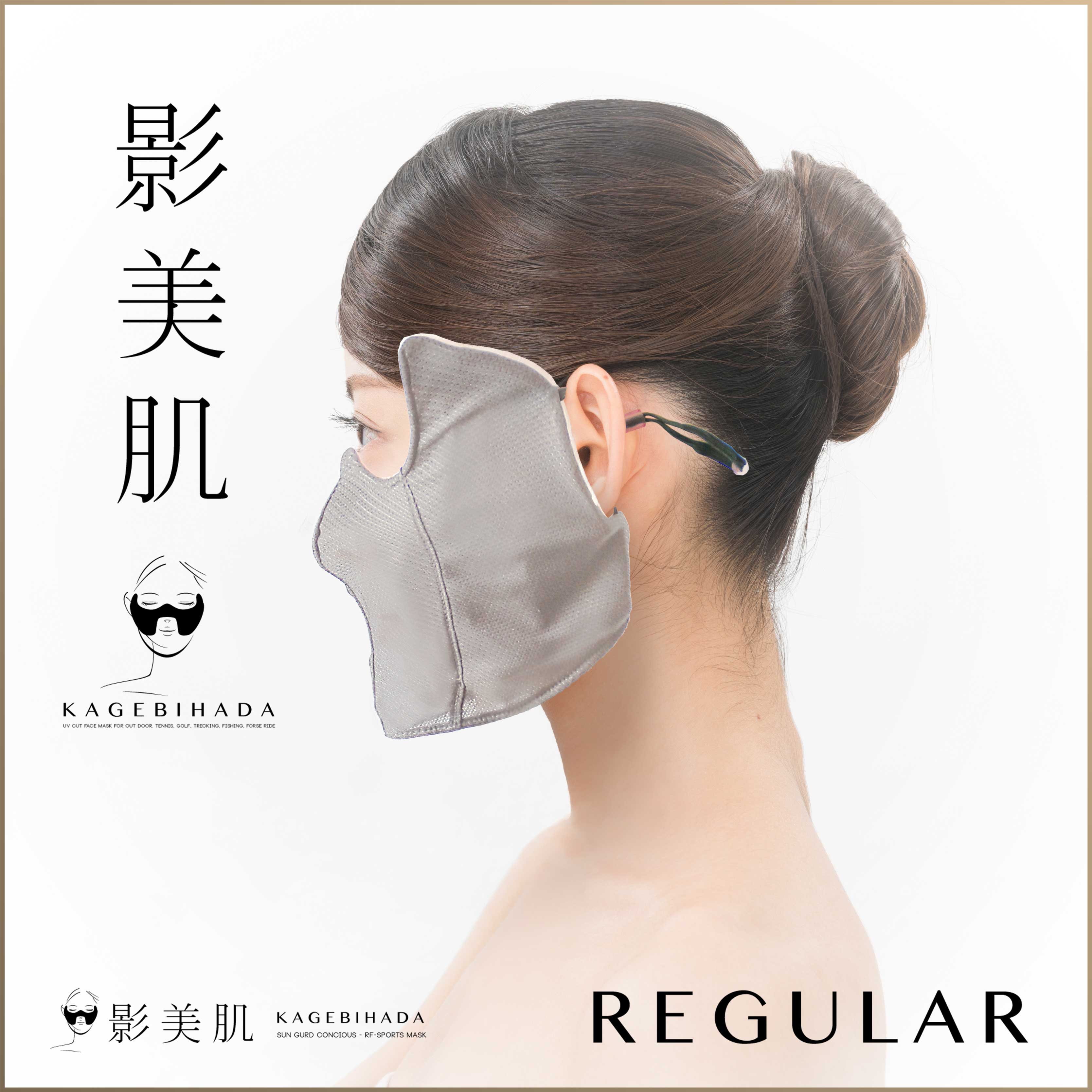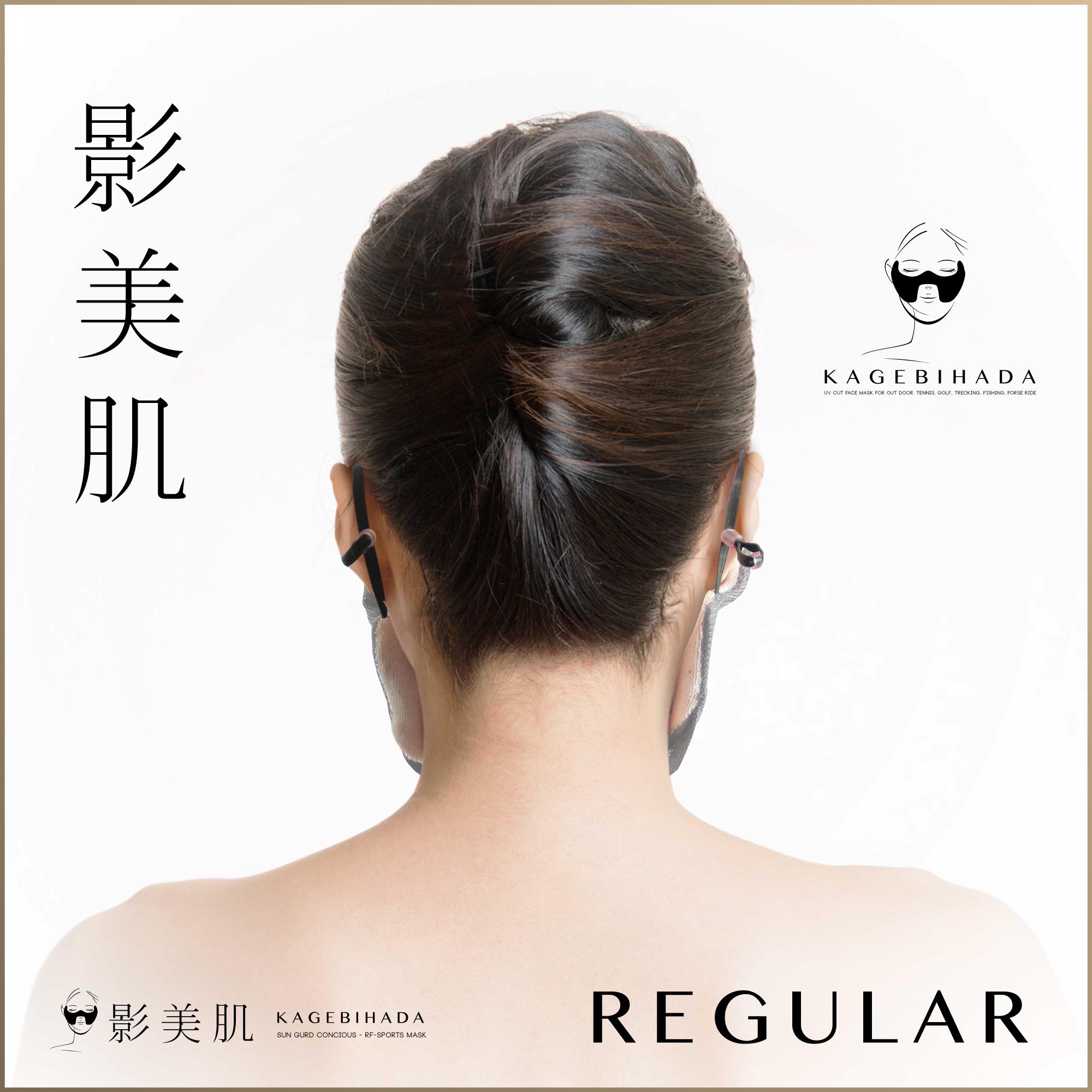 レギューラータイプは目尻をしっかりガードでき、簡単に装着できる一番定番のモデルです。快適性と守備範囲のバランスを意識しており、息のしやすさはもちろん、裏地にはパイル時を使用し、汗をしっかり吸収してくれます。耳ゴムのみで装着し、サンバイザーや日焼け止めなどと併用すると更に高い効果を得ることが出来ます。