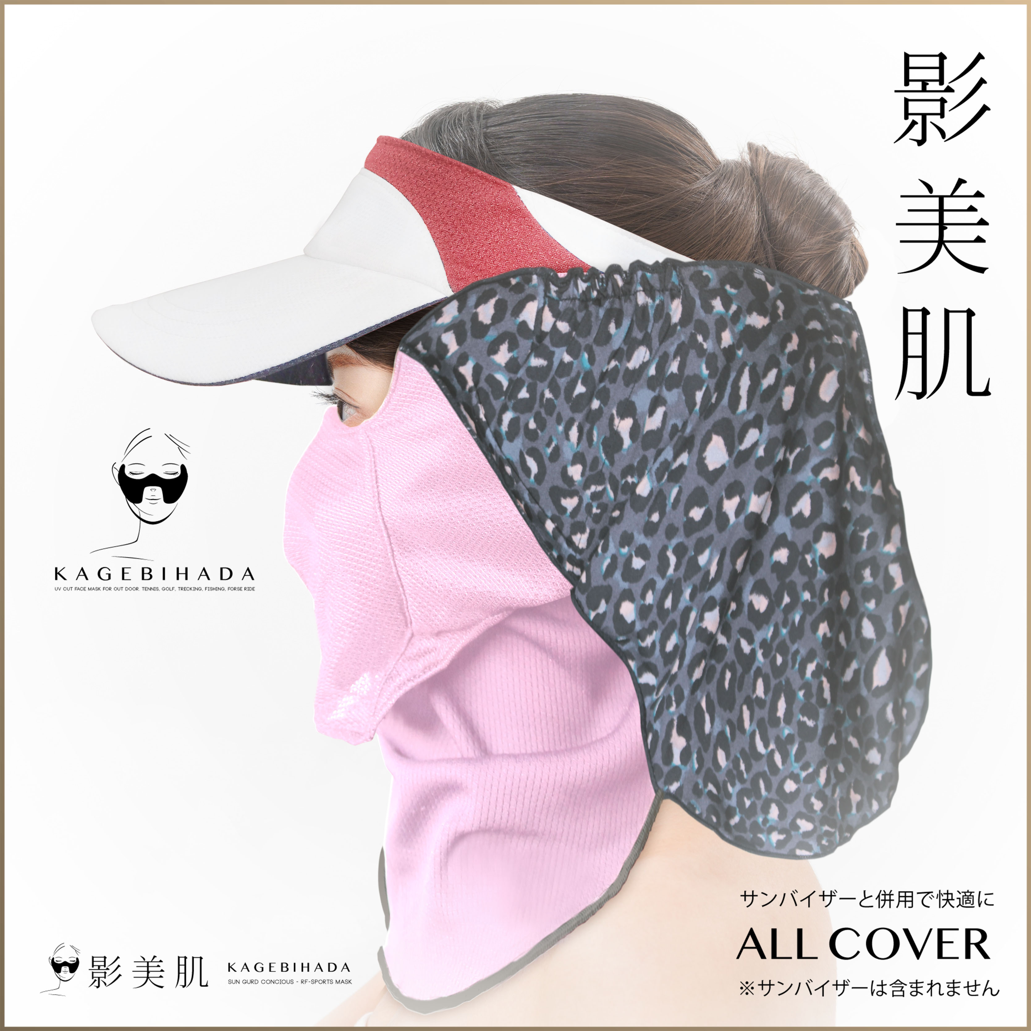 オールカバータイプは、耳、デコルテ、首から首の後までと、シリーズの中で最も広範囲をカバーできるモデルです。耳ゴムに付け加えて、頭の後ろのボタンで固定します。また、後ろの部分はサンバイザーに引っ掛けれるようになっており、ずれ落ちるのを防止します。これだけガードしても、呼吸のしやすさはまったく変わりません。水分補給も、スカーフとマスクの間から簡単に行うことが出来ます。サンバイザーや日焼け止めなどと併用すると更に高い日焼け防止効果を得ることが出来ます。(耳ゴムの長さ調節機能付き)