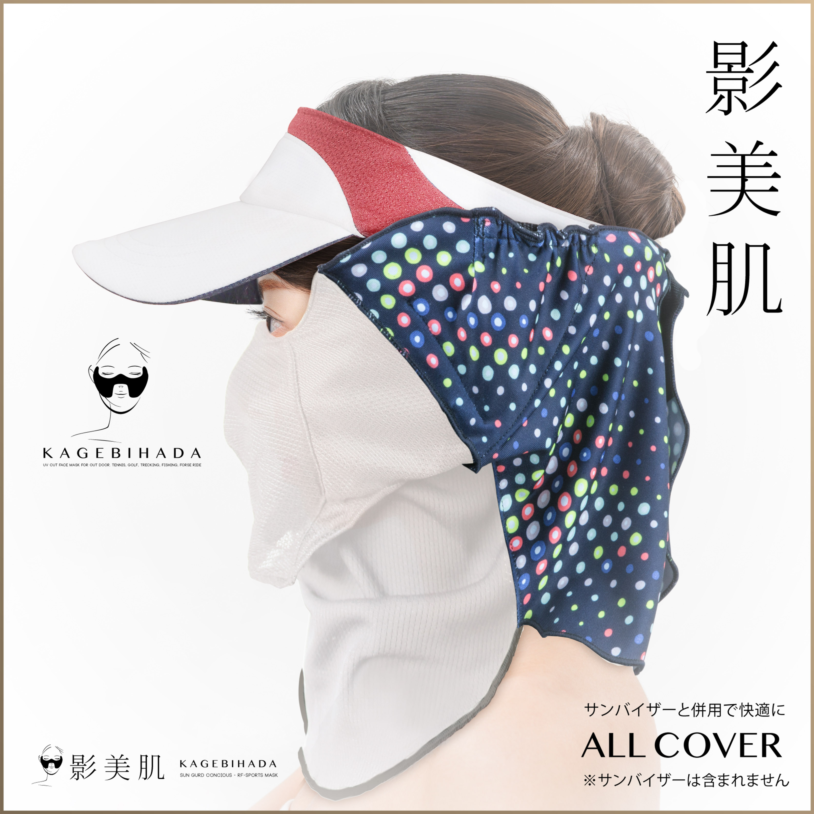 耳、デコルテ、首、さらに、首の後ろも。影美肌の中でも最も広範囲を保護できるオールカバータイプ。背面はサンバイザーやキャップに固定することが出来るようになっており、沢山動いても下がってきません。 無地といくつか柄のバリエーションが選べます。